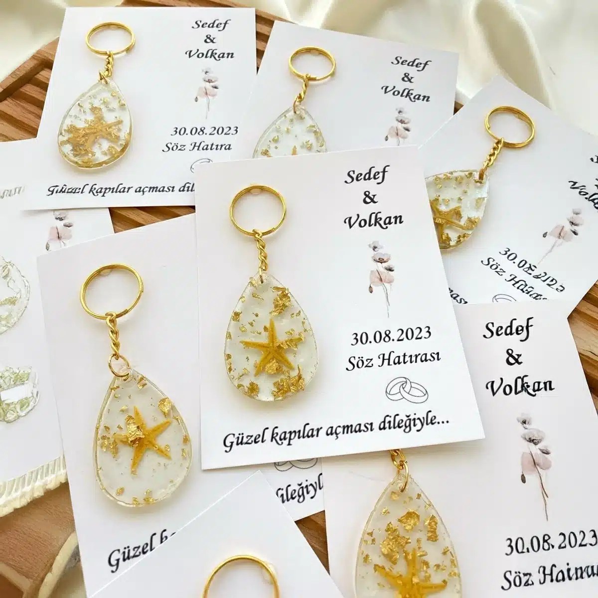 Each keyring features a golden drop-shaped design with shimmering flakes, paired beautifully with a matching invitation card.
